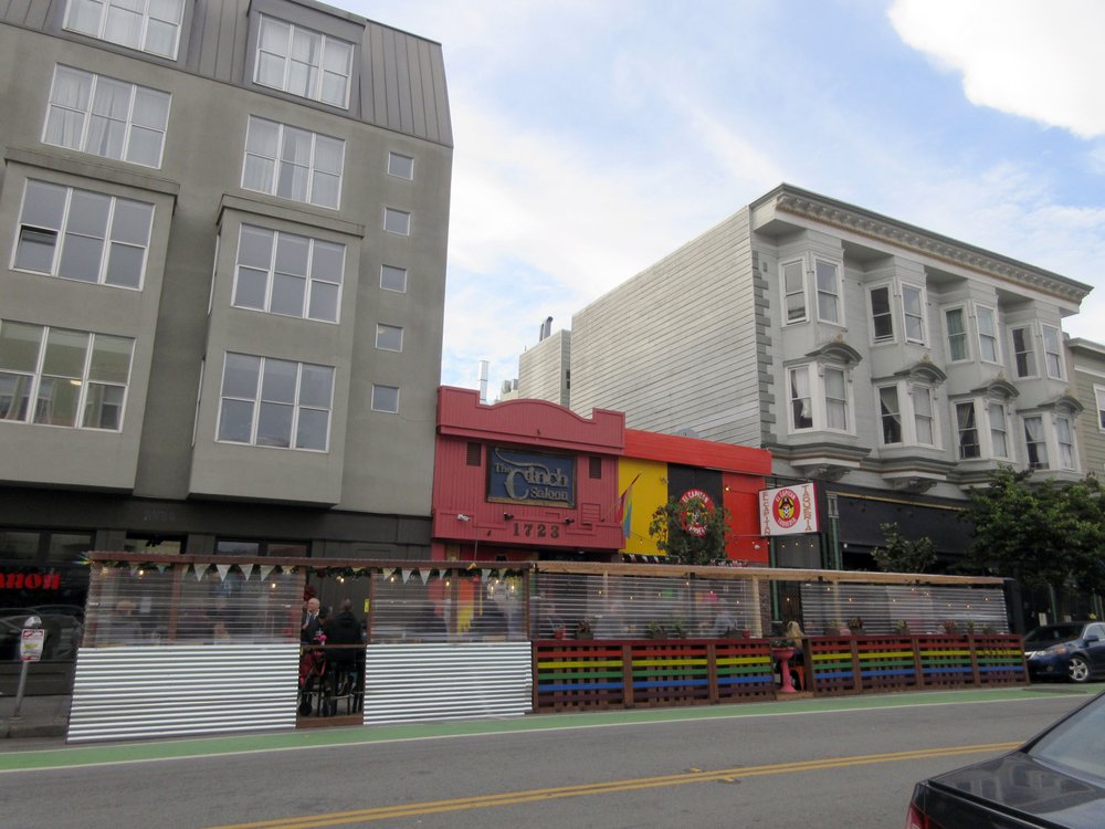 The Cinch located in San Francisco is a popular gay dive bar with a unique and vibrant atmosphere. Customers rave about the strong drinks, great music, pool tables, and cute patio for smoking. The bar has a secret Star Wars themed back area and is known for its friendly bartenders. Despite the lack of food options, patrons enjoy the happy hour specials and diverse crowd. The vintage decor and welcoming ambiance add to the charm of this establishment, which is considered to be the city's second oldest gay bar. With a variety of amenities such as outdoor seating, free Wi-Fi, and a full bar, The Cinch is a lively spot for drinks and socializing.